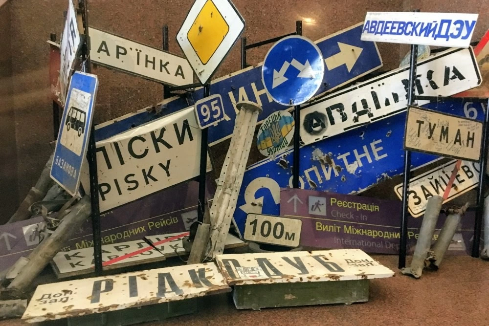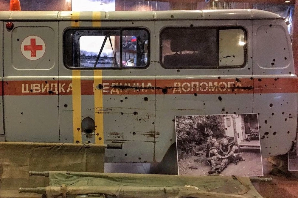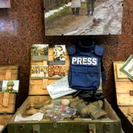 Noua expoziție de la muzeu se numește Pe linia frontului și conservă obiecte care, cu doar câțiva ani în urmă, făceau parte din viața de zi cu zi a unor oameni. Sunt acolo haine de preoți, care au mers pe front în fața lucrătorilor sanitari, ca să-i protejeze de focul de arme. O ambulanță militară - o dubiță gri, ciuruită de gloanțe, veste anti-glonț ale jurnaliștilor, semne de circulație care amintesc numele tuturor localităților ocupate. Aparate foto, gamele, genți - ale voluntarilor, preoților și militarilor, toate culese din mijlocul unui război care continuă și astăzi.