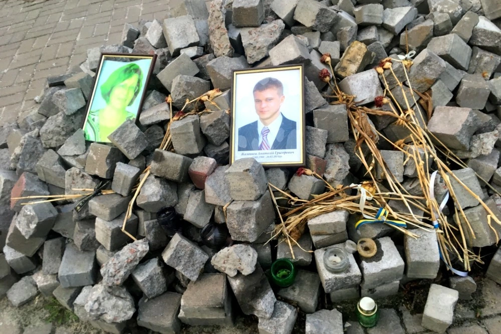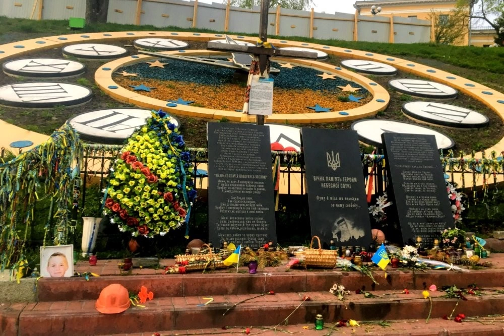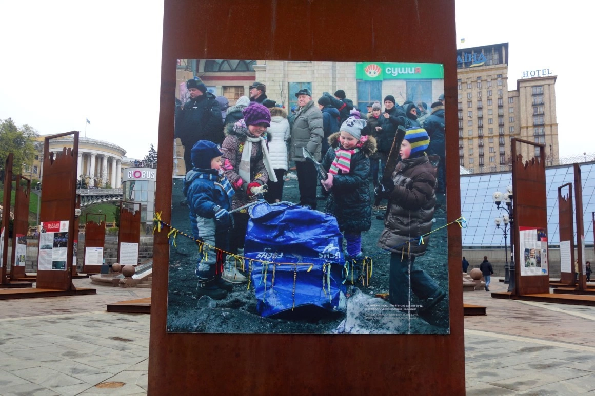 În Piața Independenței au rămas vestigiile revoluției sângeroase, care a pornit din alegerea Ucrainei de a privi spre Europa. Nu se știe nici azi cu siguranță câți oameni au murit atunci - unele estimări merg până la 130 de decese, dintre care 18 din rândul forțelor de ordine. Pe strada paralelă cu Maidanul, Institutska, și în Piața Kreșceatik, alăturată, rămân micile altare ale Maidanului. Bucăți de baricade de-atunci, din cauciucuri și fiare. Grămezi de pietre de pavaj, alături de portretele celor uciși. Gaura în pământ, unde era clădirea incendiată, se pare, de către controversata poliție militară Berkut, desființată în urma Maidanului. Lumânări, rugăciuni pentru Ucraina.