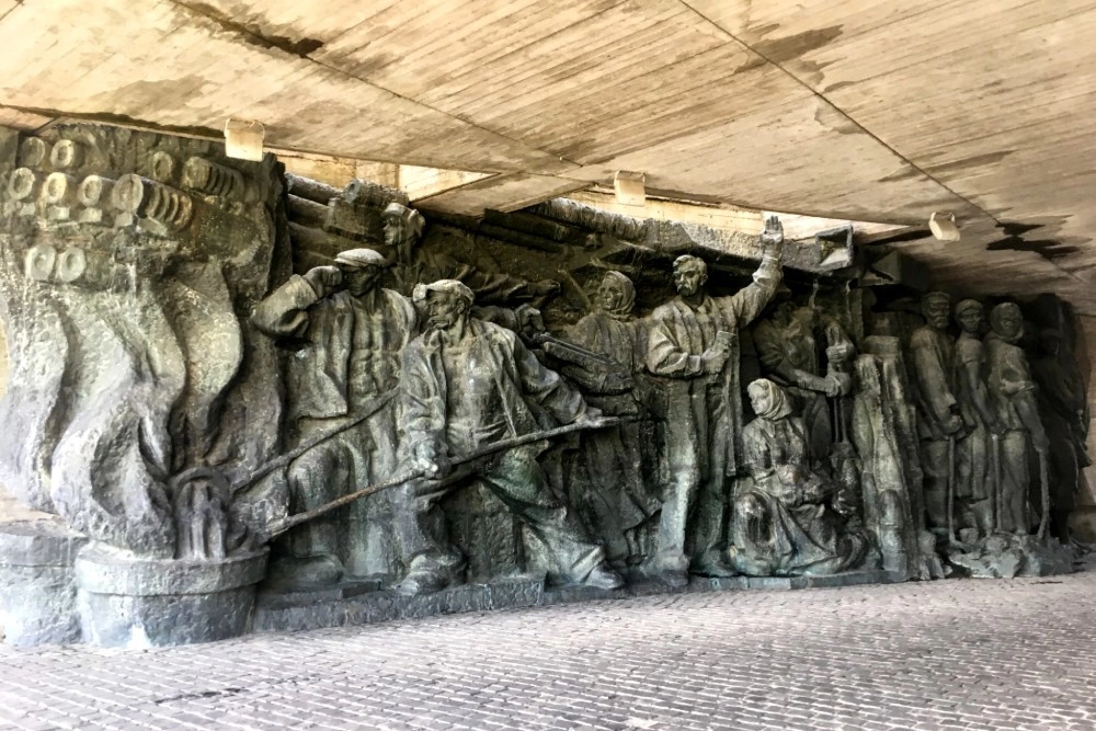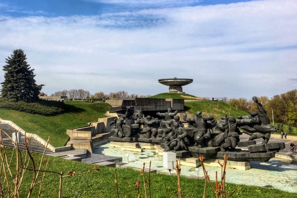 Cu un bilet de autobuz care costă mai puțin de un leu ajung pe dealul verde unde se află Muzeul Național al Istoriei Ucrainei în al Doilea Război Mondial. E o zi cu vreme de picnic și e plin de vizitatori. Își fac selfie-uri cu statuia uriașă a Patriei Mamă, care veghează cu sabia în mână asupra complexului muzeului. În parc mai găsești și un mare basorelief al luptătorilor din rezistența anti-nazistă, precum și un „OZN” sovietic - o farfurie uriașă din beton, care ținea aprinsă „Flacăra eternă a gloriei”.