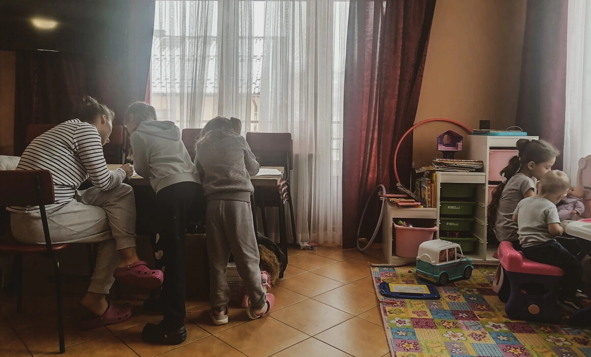 De aici plecăm spre pensiunea care funcționează acum în întregime ca un orfelinat ucrainean pe teritoriul polonez. E o clădire cu două etaje, dosită între păduri, în vecinătatea unei biserici. În curte se află un micuț autocar alb cu număr de Ucraina, pe parbrizul căruia este încă afișat mesajul: „Copii” (folosit ca măsură preventivă în fața rușilor, în drumul lor spre granița cu Polonia).