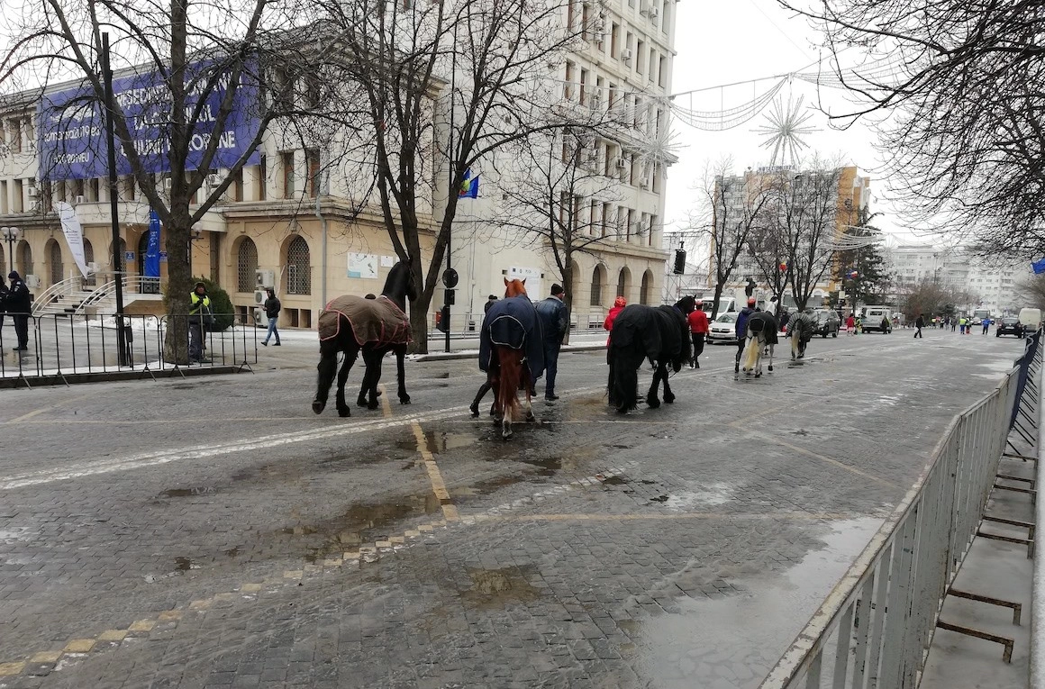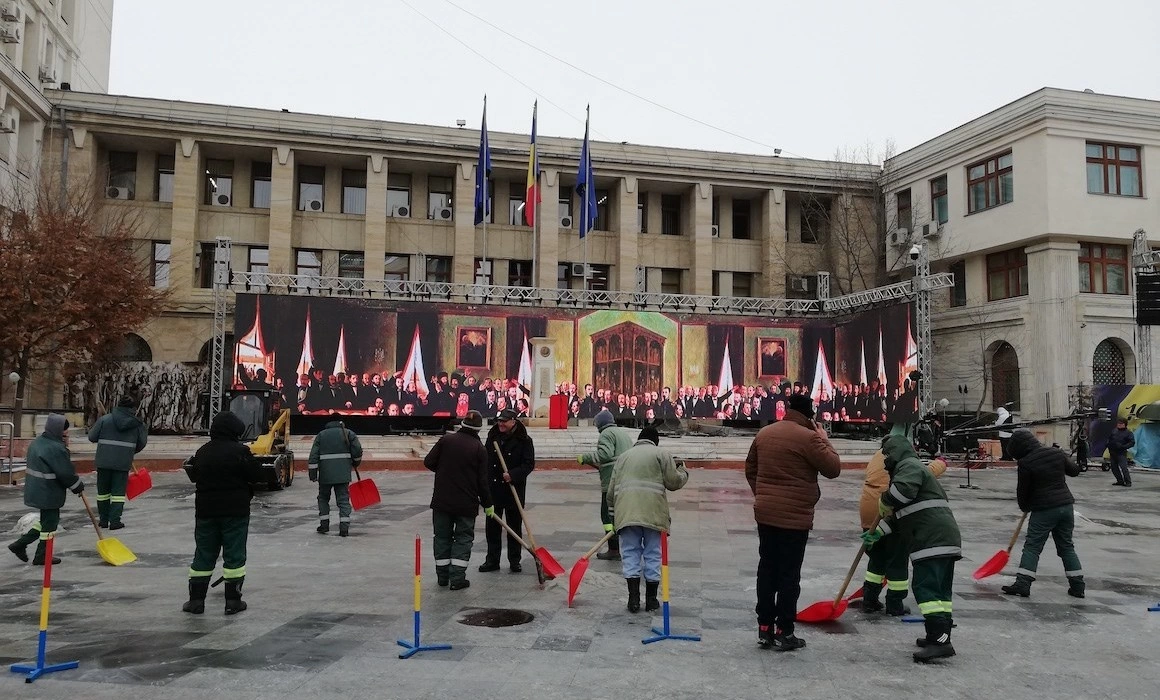 Cu vreo oră înainte să înceapă programul artistic, câțiva oameni se învârt înfrigurați prin Piața Unirii. Dreptunghiul pieței e dominat de obeliscul dedicat Unirii, aflat în lucrări de reabilitare din aprilie 2017 și îmbrăcat încă într-o mușama zdrențuită. Centrul evenimentului e însă mai încolo, în dreptul sediului Consiliului Județean: e amplasată acolo o tribună, iar în spatele ei e un ecran lung, cu o scenă din timpul săvârșirii Unirii. Alături sunt amenajate două scene: pe una dintre ele vor urca tinerii care vor intepreta imnul național alături de Paula Seling și Gheorghe Zamfir, iar pe cealaltă, plasată înspre bulevard, aleșii vor urmări parada militară. Această zonă pregătită pentru invitați e separată cu garduri și cu stâlpișori tricolori de cetățenii de rând, iar jandarmii sunt împrăștiați peste tot. Detașamente de angajați ai serviciului local de curățenie sparg gheața de pe trotuare și-i ocolesc cu grijă pe cetățenii care se opresc pentru a admira caii pregătiți pentru defilare, lângă clădirea ansamblului folcloric Țara Vrancei.