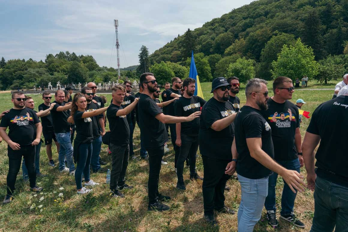 Pe la 10, însă, mai mulți bărbați îmbrăcați în negru încep să mărșăluiască pe potecile mănăstirii, agitând tricolorul. Nu pare să le stea nimic în cale, nici măcar arșița care a trecut de munții Făgăraș încă de la primele ore ale dimineții. Se opresc în fața unei cruci, unde alți bărbați voinici întind o masă cu pâine împletită, vin și candele roșii. Întind tricolorul pe iarbă și în brațele oamenilor așezați pe două coloane: de-a stânga crucii stau cei în costum popular, de-a dreapta cei ce poartă ochelari de soare fumurii și tricouri negre. Pe ele scrie ULTRAS, alături de logo-ul „Uniți sub tricolor”, o grupare de suporteri ai fotbalului fondată de liderul partidului extremist AUR, George Simion, implicată deseori în scandaluri și violențe pe stadioane. Pe câteva dintre steagurile lor flutură chipurile legionarilor Ion Gavrilă Ogoranu și Valeriu Gafencu, foști membri ai grupurilor de tineret din Mișcarea Legionară.