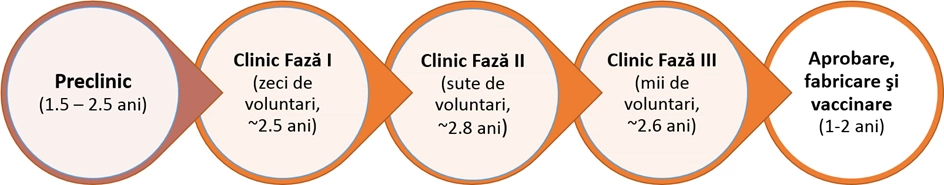 Şi ca să înţelegem ce este posibil şi ce nu, trebuie să detaliem puţin. Prima etapă este cea de cercetare preclinică, în care se selectează tehnologia care va intra în componenţa vaccinului şi apoi se testează eficienţa şi profilul de siguranţă pe celule umane (in vitro) şi pe modele animale (in vivo). Dacă in vitro efectul anti-infecţios este cel aşteptat şi nici nu mor excesiv de multe celule, se trece la studii in vivo, pe animale*.
