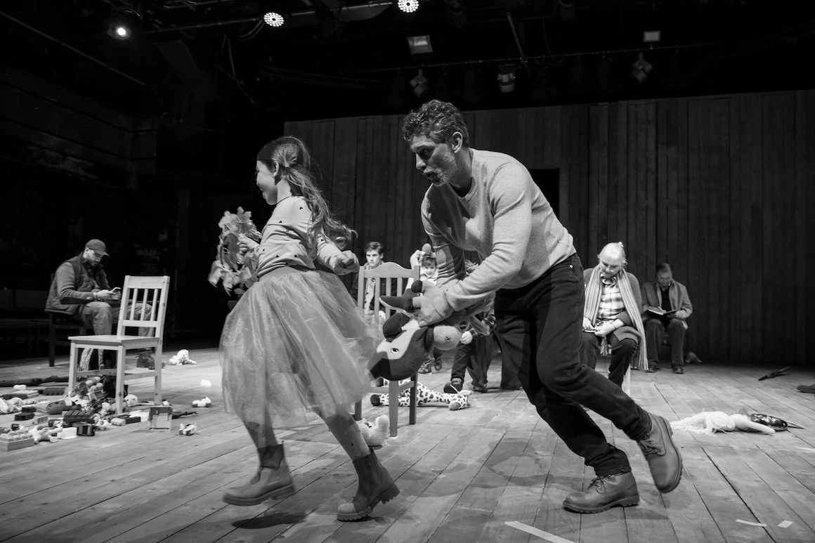 Aici este și rateul spectacolului, în lipsa unei dinamici de evoluție. Situația devine explozivă, personajele individuale și de grup parcurg un traseu emoțional complicat, cu răsturnări și situații-limită, acționează uneori contrar naturii lor sau fac gesturi extreme, dar asta nu se percepe în spectacol, unde toți rămân aproape mereu într-o singură stare, instalându-se monotonia. Hilde e agitată de la început și așa rămâne, Per e febril, prietenii afișează permanent o masculinitate toxică, mama fetiței este nefericită și are tot timpul un aer de reproș, chiar și tatăl, cu toate dilemele în care plonjează, se manifestă prea puțin. Și asta în ciuda schimbării radicale a atitudinii comunității față de Lucas. De altfel, comunitatea însăși, ca grup, nu se simte aici în mod real amenințătoare, deși există o coregrafie care susține energia agresivă a grupului masculin, iar personajele rămân în spațiu și penumbră în aproape toate scenele, ca o prezență tăcută care ar trebui să fie apăsătoare. Spectacolului îi lipsește însă o tensiune care să crească și să explodeze în cruzime, căci exact asta explorează textul, drumul până la crimă, cu construcția binomului ură-frică, și nu violența în sine, motiv ca actul propriu-zis să nici nu fie vizibil. În spectacol însă, ideile, argumentele, narațiunea sunt expuse aproape rece, metodic (doar muzica reușește să inducă oarecum instalarea terorii), fără forța de a reda solidaritatea în ură a comunității care vânează și angoasa crescândă a vânatului.