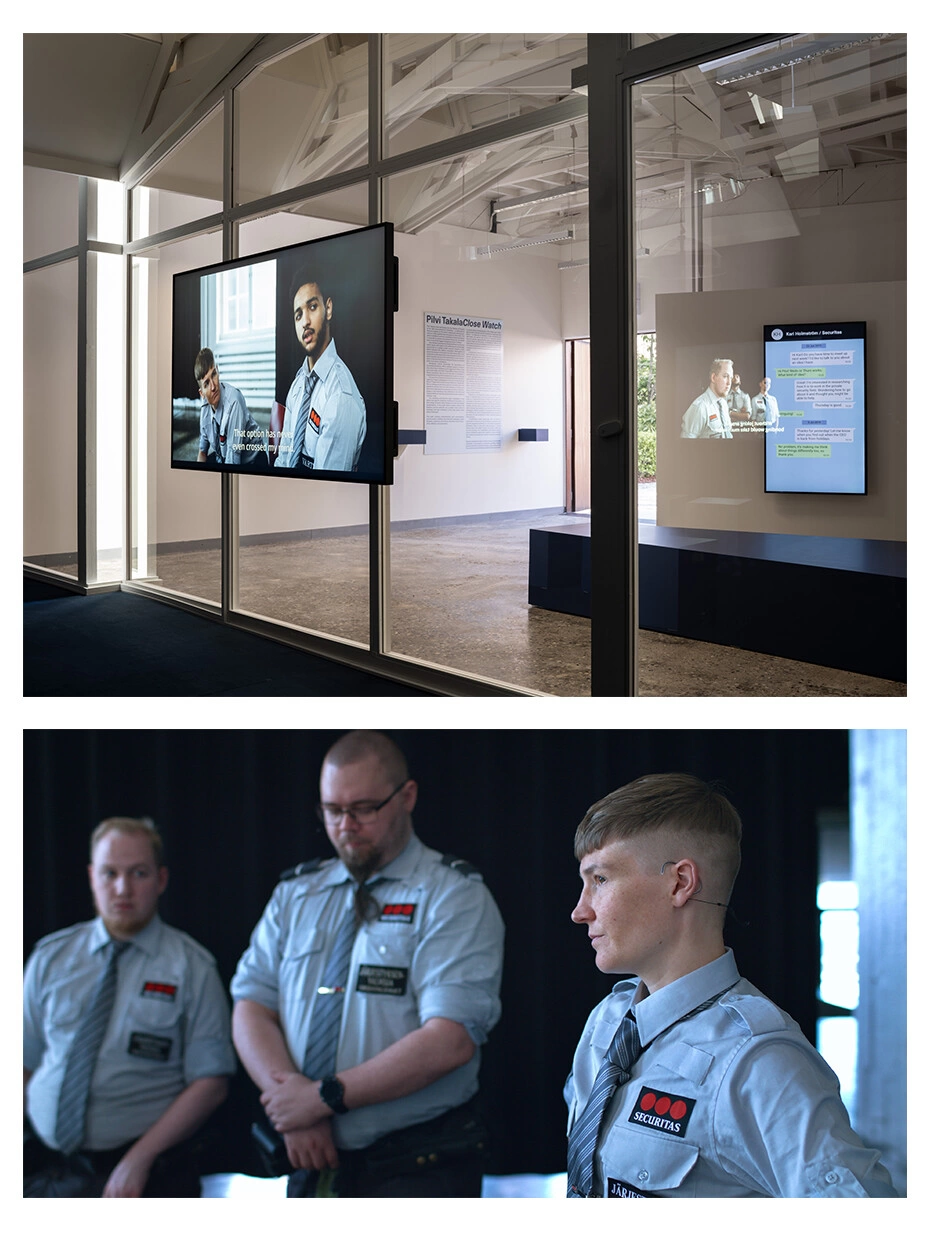 În pavilionul Finlandei, instalația video Close Watch pornește de la propria experiență a artistei Pilvi Takala, care a lucrat ca paznic undercover, timp de șase luni, în cel mai mare centru comercial din Finlanda. Sunt interesată de modul în care este impus controlul în cadrul industriei private de securitate și de modul în care, în cele din urmă, ne guvernăm reciproc comportamentele, spune Takala. Lucrarea video prezintă momente din atelierele de lucru unde Takala, împreună cu foștii colegi de muncă și câțiva actori, redau studii de caz extrase din cercetările de teren ale artistei. După ce ies din pavilion, un vizitator mă-ntreabă dacă știu unde e pavilionul Japoniei sau cel al Singapore, și dacă nu sunt cumva artista Pilvi Takala (probabil de la tunsoare). Mi se confesează că nu-i place expoziția și nu are timp să stea să vadă o lucrare de lungă durată într-un context cum e Bienala. Curatorul ar trebui să se gândească la asta. Sunt furios pe curator. Apoi aflu că e artist și îmi oferă un flyer cu o invitație la expoziția lui NFT de la Palazzo Giustinian Lolin, unde nu m-am dus.
