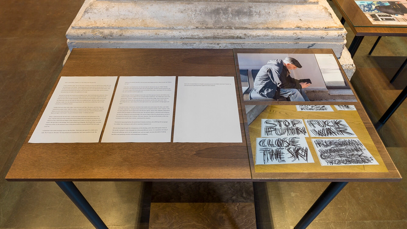 Scriitoarea Yevgenia Belorusets expune fotografiile și jurnalul ei încă de la debutul războiului. Artistul Nikita Kada a construit o instalație Difficulties of profanation II (2015-2022), care conține fragmente de metal adunate din conflictul din Donbas din 2015, cât și o selecție de imagini de arhivă și obiecte adunate de pe străzile Kievului în martie 2022. Artista Lesia Khomenko expune patru tablouri uriașe Max Is in the Army series (2022), cu civili îmbrăcați în haine normale, ținând arma în mână. Intervențiile celor trei sunt prezentate în dialog cu lucrările Mariei Prymachenko, una dintre cele mai apreciate artiste ucrainene din secolul XX. Picturile Boxers (1977) și Ancient Wolf (1987), au fost salvate din Muzeul Ivankiv, de un localnic, înainte ca acestea să fie incendiate de forțele rusești.