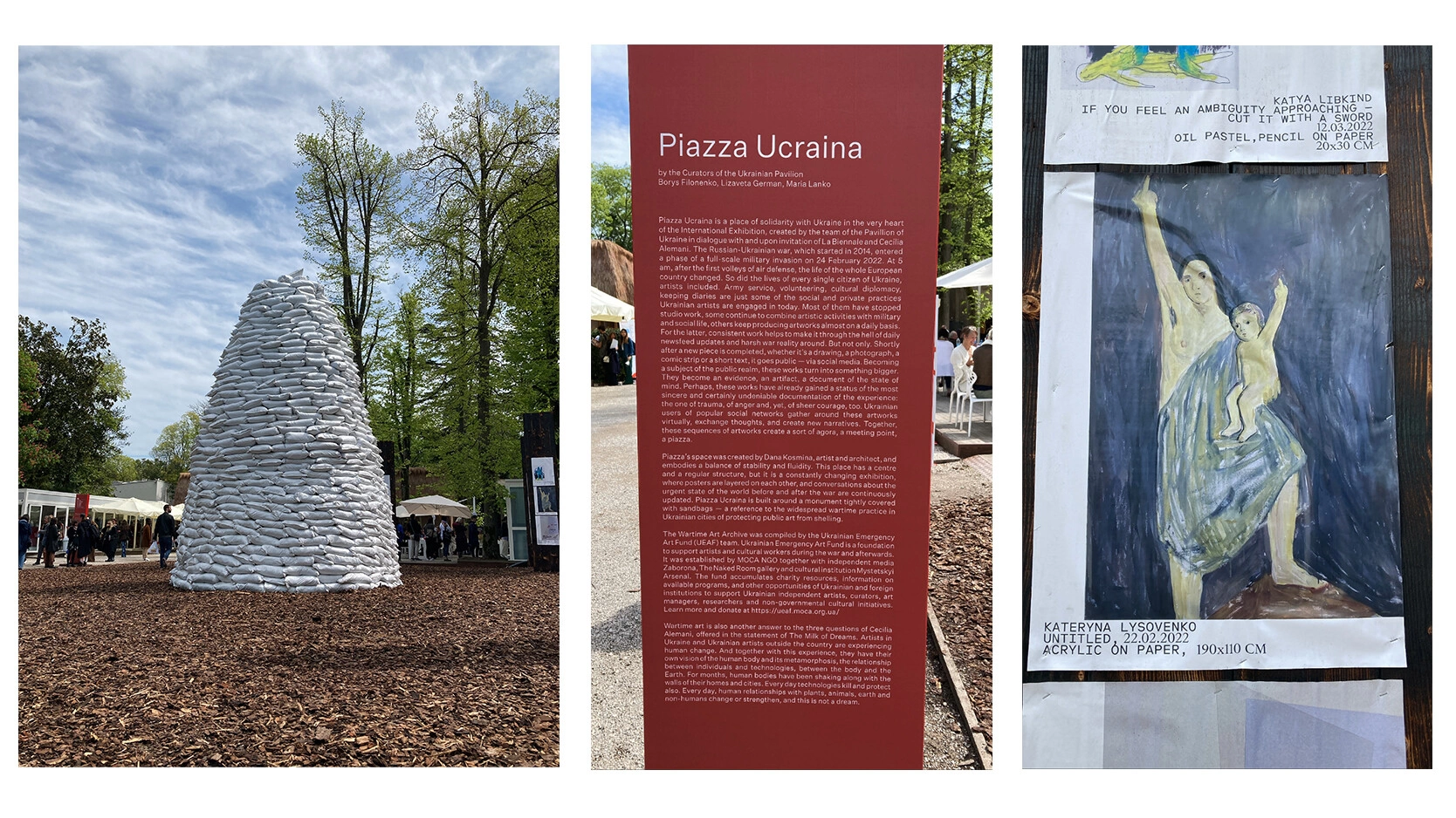 După pavilionul României, ajung în Piazza Ucraina. O expoziție în aer liber în Giardini, realizată de echipa curatorială a pavilionului ucrainean (Borys Filonenko, Lizaveta German, Maria Lanko), proiectată de artista și arhitecta ucraineană Dana Kosmina. Piazza Ucraina a fost construită în jurul unui monument acoperit cu saci de nisip – o practică răspândită încă din Primul Război Mondial, cu scopul de a proteja arta publică împotriva bombardamentelor. În jurul monumentului sunt expuse pe niște structuri de lemn, arse cu o torță de suflat, afișe cu ilustrații realizate de artiști ucrainieni după invazie. Noi imagini vor fi adăugate pe parcursul Bienalei de Wartime Art Archive, prin Ukrainian Emergency Art Fund – o fundație care sprijină artiștii și lucrători culturali pe timp de război, aflu de la curatorul Borys Filonenko.