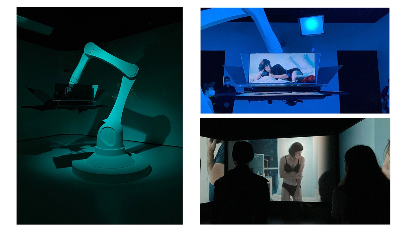 Mă plimb prin spațiu și observ reacțiile vizitatorilor, prinși și surprinși într-o capsulă a intimității expusă prin conversații, atingere și dans, de protagoniștii Laura Benson, Hanna Hofmann, Hermann Müller și Dirk Lange. Între cei ce aleg să rămână în spațiu și cei care pleacă, sunt cercurile de priviri curioase în jurul brațului robotic, care susține cele trei telepromptere din încăperea căptușită într-un alb lucios. Atunci când proiecția se oprește în camera albă, brațul rămâne iluminat într-un verde turcoaz, iar vizitatorii se mută în încăperea alăturată, unde continuă proiecția. „De ce îți este frică?”, întreabă Laura, protagonista din Touch Me Not. Pe ecranul alăturat, Adina se uită fix în camera de filmat, cu ochii înlăcrimați, și răspunde: „De a fi privită, de a fi judecată.”