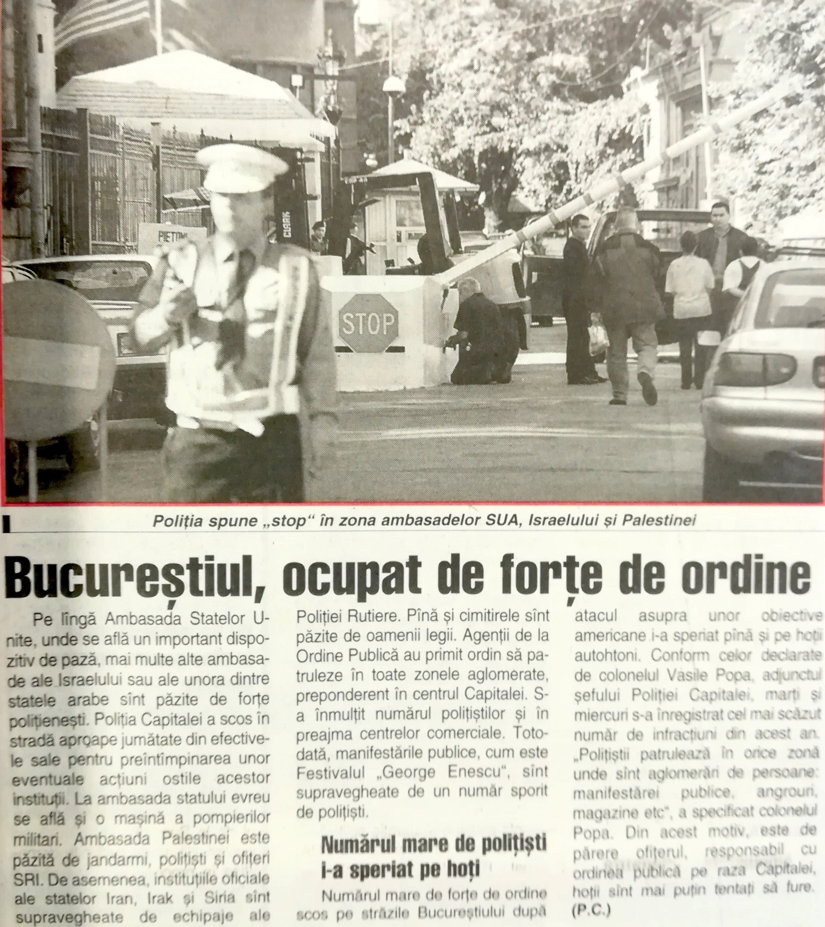 2001. În orele de după prăbușirea Turnurilor Gemene, România învață care-i treaba cu terorismul planetar, caută vinovați și se cutremură. „Evenimentul zilei” scrie că președintele Ion Iliescu și-a anulat programul și s-a baricadat la Palatul Cotroceni, că guvernul a constituit un „colectiv de urmărire a dolarului” și că apar tot mai multe amenințări cu bombe. Speriați de teroriști sau de mai degrabă de dispozitivele scoase pe străzi, hoții se abțin să iasă la muncă. E cea mai lipsită de infracțiuni zi din an, consemnează reprezentanții Poliției. „Până și cimitirele sunt păzite de oamenii legi”, scrie EVZ, darămite Ambasada SUA, transformată într-o fortăreață.