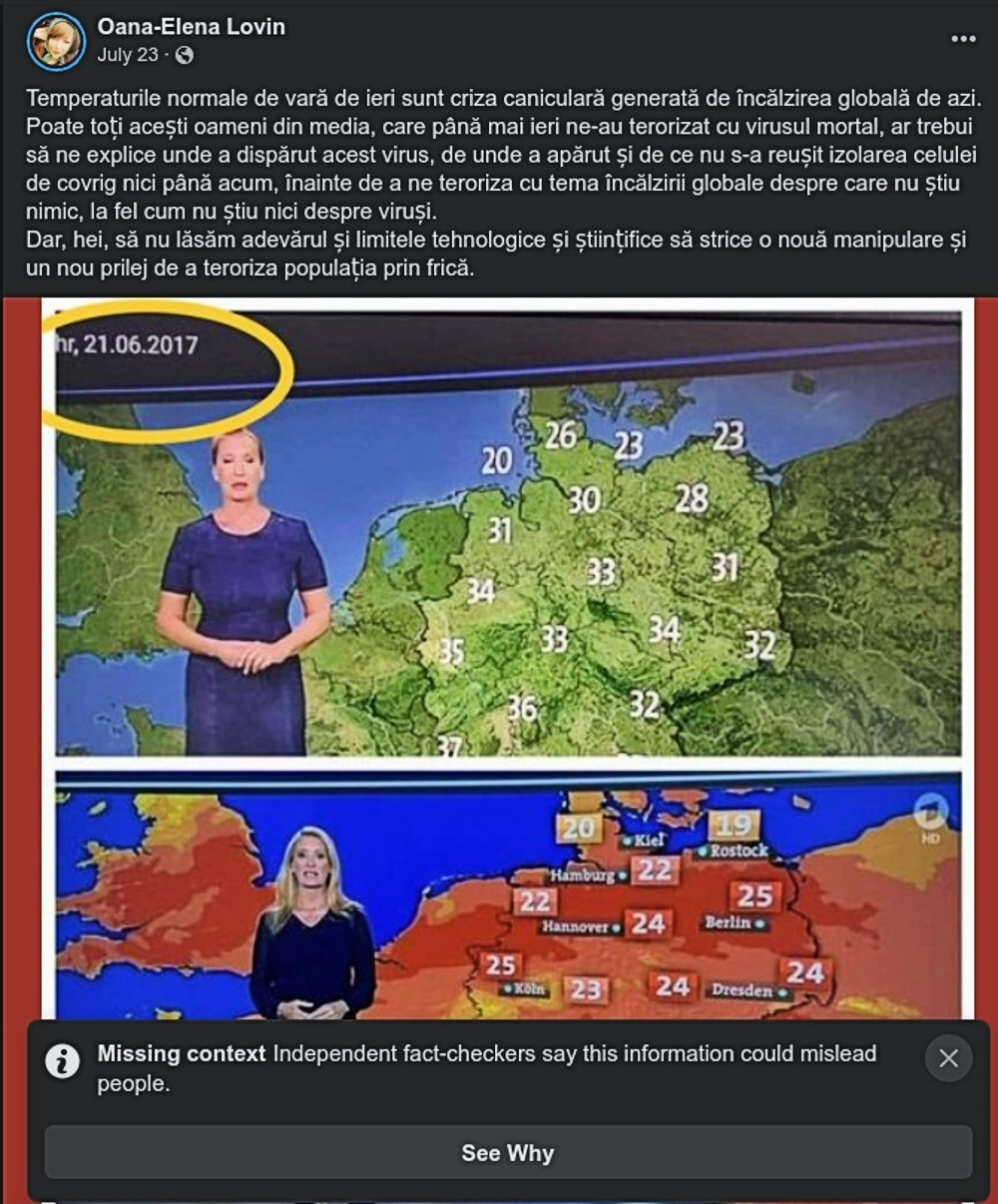 Pe lângă toate astea, Lovin promovează două dintre dezinformările punctuale care au făcut înconjurul rețelelor în ultima vreme. În prima, este vorba despre un colaj cu capturi video, care pretinde că în ultimul an temperaturile sunt colorate în roșu mai intens pentru a speria publicul. Imaginea a fost intens promovată, deși e înșelătoare, după cum arată o verificare AFP.
