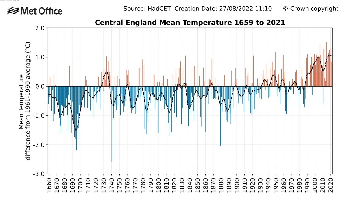 Doar că Piperea nici măcar nu se obosește să afle de ce se vorbește de ultimii 250 de ani; ar fi aflat poate că doar din 1772 există înregistrări zilnice ale temperaturilor, ca să poată fi făcute comparații, nicidecum faptul că atunci ar fi fost temperaturi record. De altfel, într-un grafic cu evoluția temperaturilor medii anuale în perioada 1959-2021, se observă că deceniul 1770-1780 nici nu a fost unul foarte călduros.
