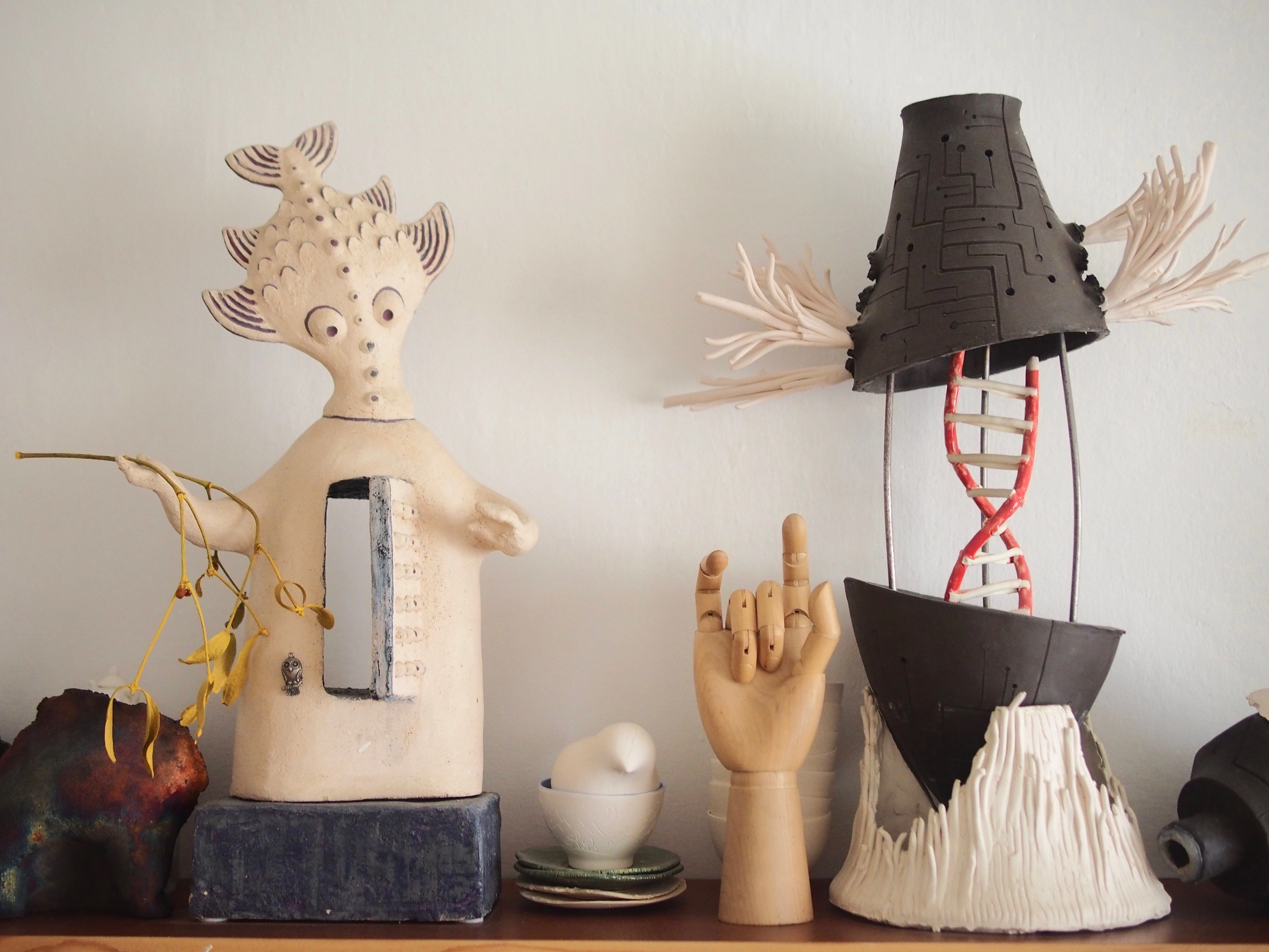 Atelierul e în sufragerie: în mijloc, o figurină mare din ceramică, cu cap de pește și cu o ușiță în dreptul pieptului. Camera e tapițată cu desene și picturi ale Ilenei și Mariei, mese mari de lucru, o unealtă de întins metal, un fost aragaz transformat în cuptor de ceramică, zeci de creioane, pensule și chiar brioșe din ceramică. Mai văd câteva felii de cozonac pe o farfurie și bucăți de turtă dulce, în formă de steluțe. Astea chiar se pot mânca.