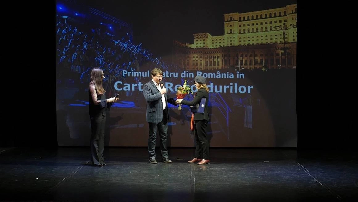 Așa își începe discursul Eveline Păuna, gazda ceremoniei. Sala este plină de lume, pe scenă este proiectată o imagine cu Casa Poporului, iar dedesubt scrie: Primul teatru din România care intră în Cartea Recordurilor.