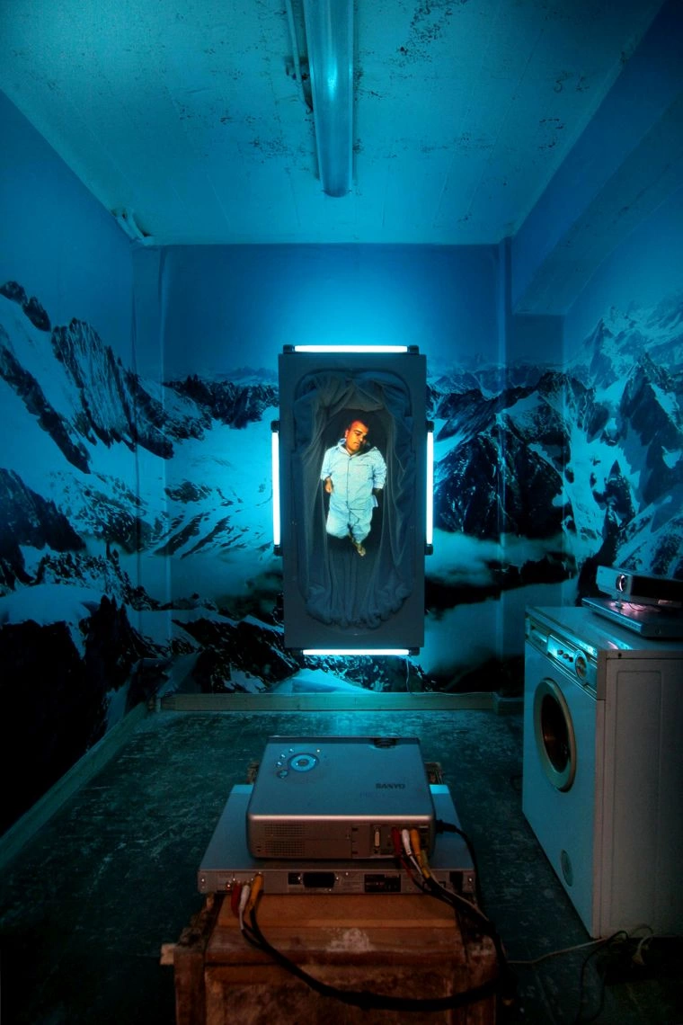 La dizertație am avut un proiect care s-a numit „Ich bin der Welt”, de la un lead de-al lui Mahler - Ich bin der Welt abhanden gekommen - și de la lecturile mele despre Jung din acea perioadă. Am compus un spațiu în care să ai epifanii care să frizeze o stare psihologică îndreptată spre patologie, în care ai apariții, apar personaje. Ceva psihotic, dar - ca în tot ce fac eu - într-o zonă blândă. Am găsit o debara mică, unde am pus un tapet cu niște vârfuri de munți albastre șu unde era, practic, o baie întoarsă pe dos. Cada era montată pe perete, mai erau o mașină de spălat și ustensile de curățat. La un moment dat, începea Ich bin der Welt abhanden gekommen și în cadă apărea un pitic, o persoană reală, un actor cu o fizionomie specială. Era proiectat în cadă, ca o apariție. Vedeai o cadă îmbrăcată într-o blană foarte pufoasă și dintr-odată se trezea în ea un personaj în pijama, cu o fizionomie impresionantă. Îmi plac foarte mult oamenii care nu sunt în canoanele firești. El era un om mic de statură, domnul Gheorghe, un actor genial. Pe celălalt perete apărea un cap uriaș, al tatălui meu, pe care-l cheamă tot Gheorghe; spunea diverse maxime absurde, de tipul „Cel mai frumos dans este Aurora Boreală.” Desigur, când comisia a venit să vadă lucrarea, au zis Da, interesant, dar puteai să vorbești și tu femeia de serviciu să-ți ia mopul de-aici.