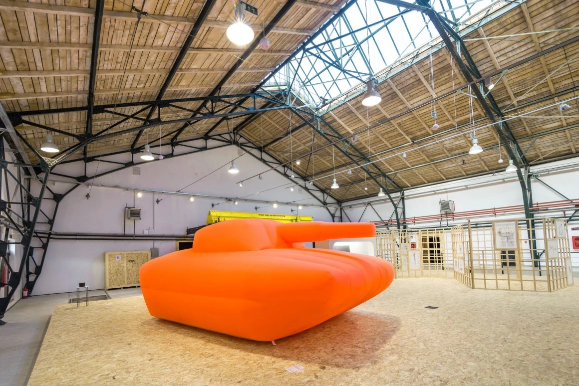 Ăsta e un tanc gonflabil (n.r. - îmi arată pe telefon), are șase metri (foto jos). Se umflă într-un minut jumate și se desumflă în 20 de minute. E parte dintr-un proiect la care lucrez acum și care se numește „Soft War”. Ideea e de a face jucării, icon-uri din sfera războiului, dar moi. Vreau să fac un fort din perne, un pistol super mare din burete, chestii care par childlike, dar sunt super serioase.