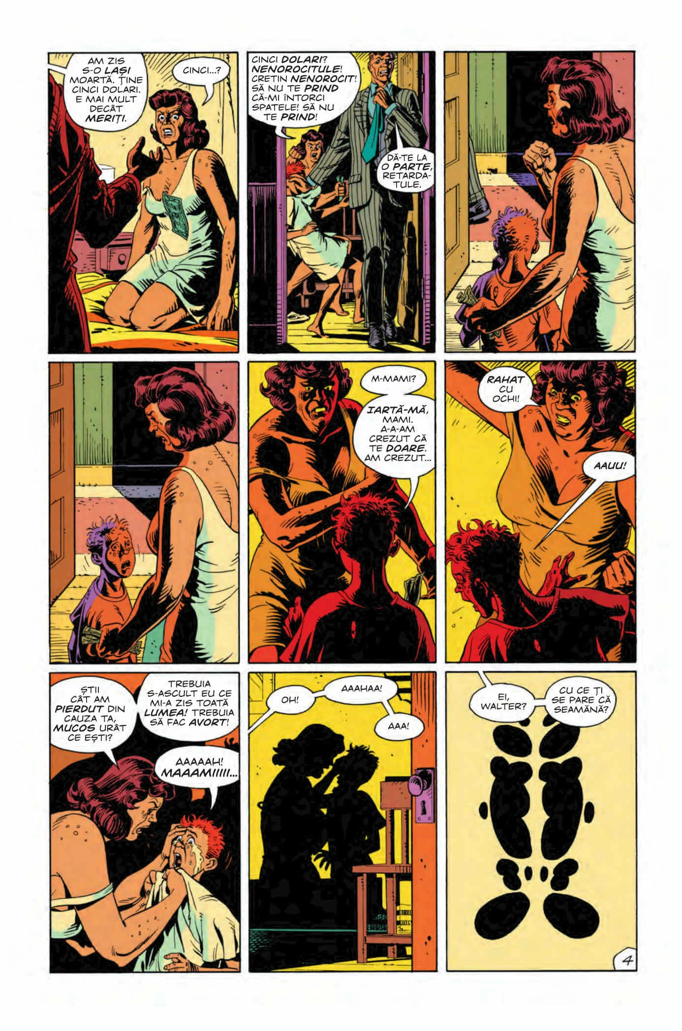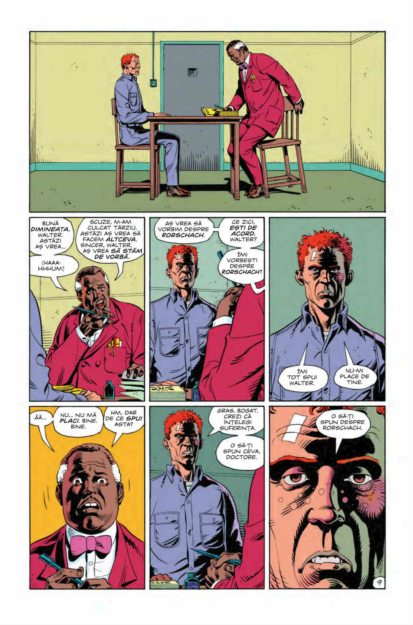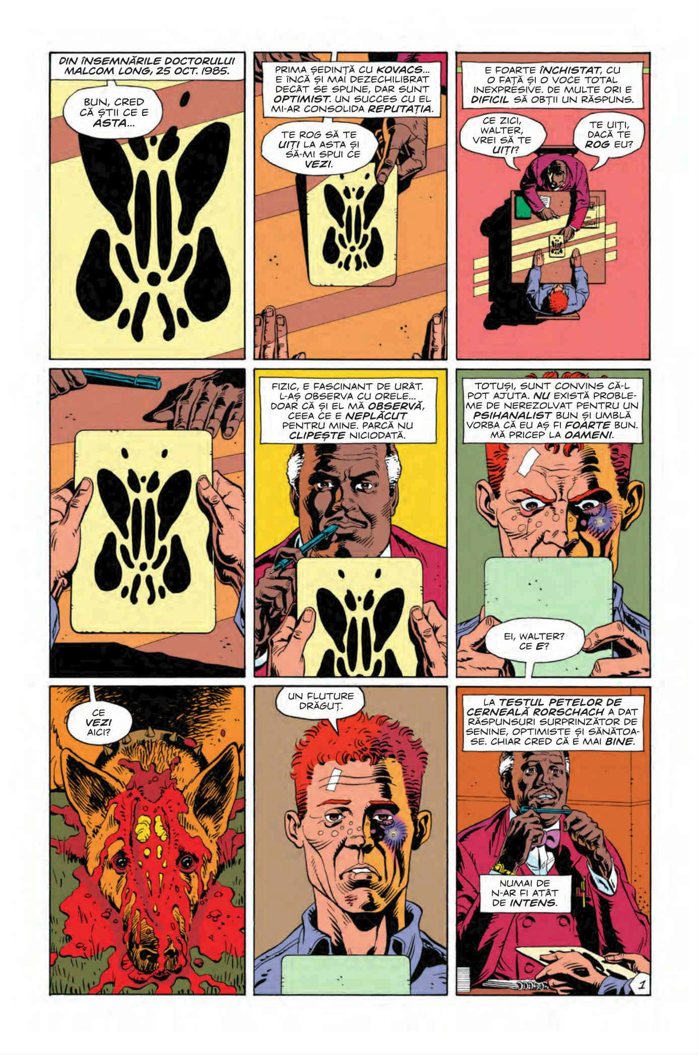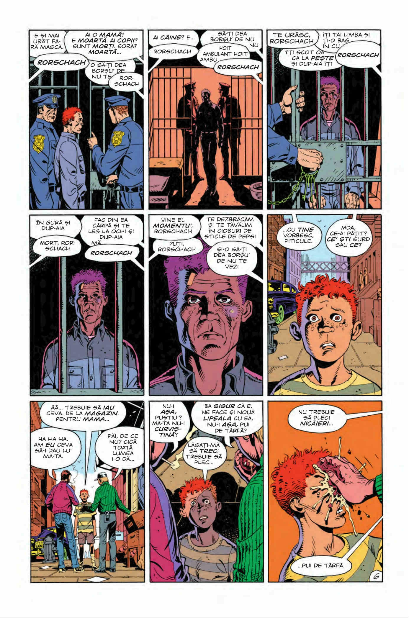 În anii '80, la vremea publicării ei, cartea asta a generat o revoluție în benzile desenate. Împreună cu alte câteva titluri, cum ar fi Maus de Art Spiegelman sau The Dark Knight Returns de Frank Miller, e considerată unul dintre cele mai puternice romane grafice (deși Alan Moore e foarte reticent față de termenul ăsta - roman grafic -, despre care crede c-ar fi mai mult o găselniță de marketing). Revista TIME a inclus Watchmen în topul celor mai bune romane din lume, de la 1923 încoace, alături de cărți ale unor scriitori ca Orwell, Philip Roth (RIP), Vonnegut sau Jonathan Franzen. Până vă faceți timp să (re)citiți - recviemul ăsta pentru supereroii clasici, vă propunem să citiți mai jos o parte din capitolul despre Rorschach. (Andra Matzal)