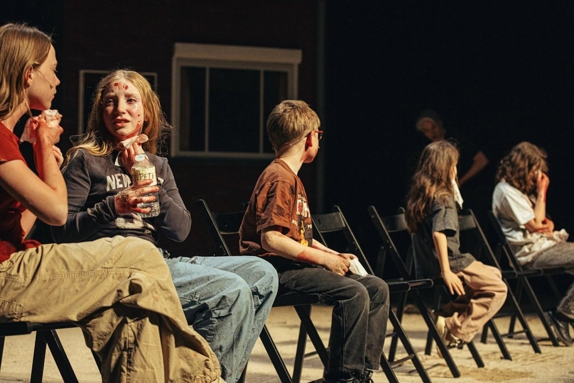 În discuții, micii performeri remarcă faptul că din teatrul antic lipsesc reprezentările copiilor și ale crimelor. Or spectacolul în care joacă ei va face exact asta, va reprezenta crime cu performeri copii. Și de la dorința lor de a juca din nou spectacolul, discuția neconvențională (tot o convenție, de fapt) alunecă ușor în teatru. Cortina se ridică și de aici încolo, arhitectura spectacolului devine hibridă, împletește pasaje filmate cu actori cu reenactment-ul acestora live pe scenă de către copii.
