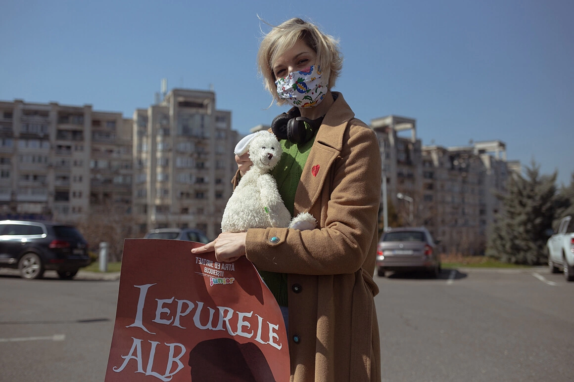 Am adus afișul de la Teatrul de Artă București, și îl am și pe Iepurele alb, un personaj în spectacolul ăsta. Autoritățile nu au grijă de noi, artiștii independenți, iar teatrele independente sunt în pericol să piară. Și nu vrem asta, uite cât de drăguț e iepurele!