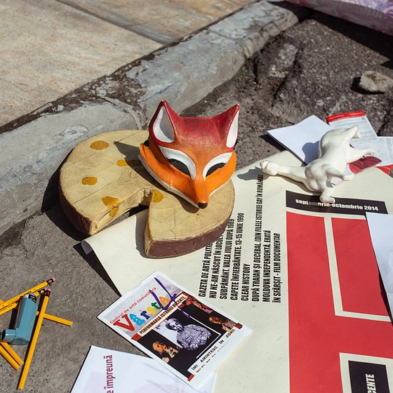Am adus un afiș și mai multe pliante de la spectacolele noastre. Obișnuiam să le lipim în oraș sau să le împărțim publicului, dar de un an încoace sunt niște obiecte care și-au pierdut sensul.