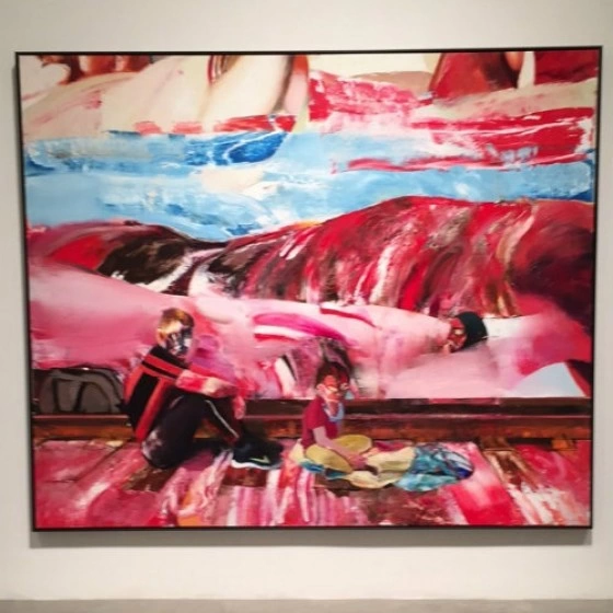 I think Alpine Retreat starts from those photos, the black Scottish Terrier in the foreground, the blue cushioned sunbeds bare witness. We may never know what went through Ghenie’s mind when he first saw the images of Hitler on vacation, but taking a closer look at his painting, seeing the layers of thick paint that seem slathered directly with his hands smearing the mountains, bright red sitting next to cold blue, Eva’s hands and face, I felt overwhelmed by a multitude of thoughts and emotions simultaneously.