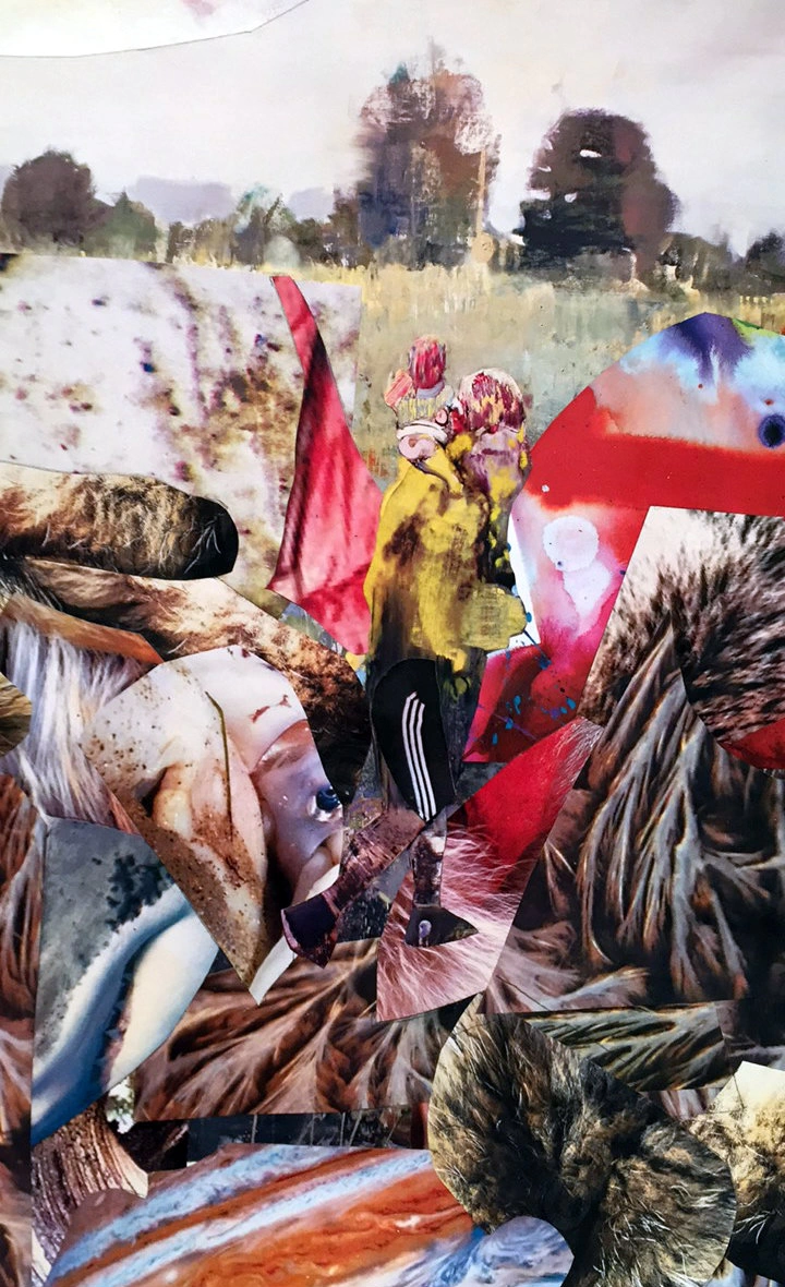 Judging by the way the pieces are arranged in the exhibition, the main painting is Degenerate Art - a deconstructed portrait of Van Gogh, which is the only piece in the gallery with a seat installed in front of it. Around it are three portraits and two collages - a good opportunity to peek into Ghenie’s process for building large scale pieces. Recently, the artist began to use collages to blueprint the structure of his paintings. It's fascinating to see how some elements from the collages are translated into color on canvas, while other details are completely replaced. For example, Van Gogh's left eye in the collage is completely different from the black cyborg-fish eye in the final painting.