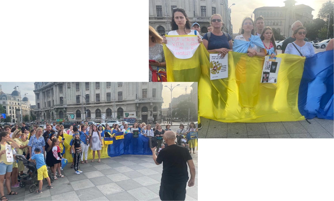 I chose the demonstration at the University square on purpose, as I saw an ad on one of the Facebook groups for Ukrainian refugees in Romania. I was intrigued by the co-organizer of the event, the "21 Decembrie 1989" Association. As my Romanian wife explained to me, it was an old political group, tracing its roots from the students’ protests during the 1989 revolution, and now enjoying controversial fame for its conservative-nationalist agenda. The meeting between highly politicized Romanian organizers and Ukrainians who gather on the occasion of the Independence Day, at a time when Ukraine’s independence is in mortal danger, promised a glimpse into a political self-representation of Ukrainian migrants. There, the celebration of the Ukrainian Independence Day would confront the site of the most iconic Eastern European 1989 revolution. The destination of the march, the Russian embassy in Bucharest, promised an emotionally heightened culmination of the event.