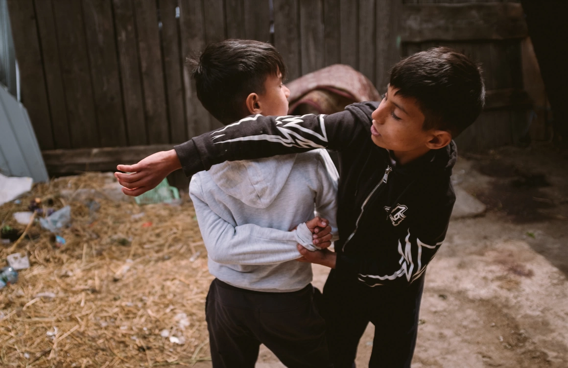Two of her children, Maria (11) and Vasile (9) had managed to run off to their grandmother. The police found the youngest one hiding. “I was hiding over there, in our shed, out back, behind those tin sheets, in the yard,” says Nicolas, a six-year-old boy, his eyes glued to the ground. He says a police officer tugged at his arm, twisted it around his back and flicked him across the forehead. Then, he also made him kneel next to his mother, by the gate.