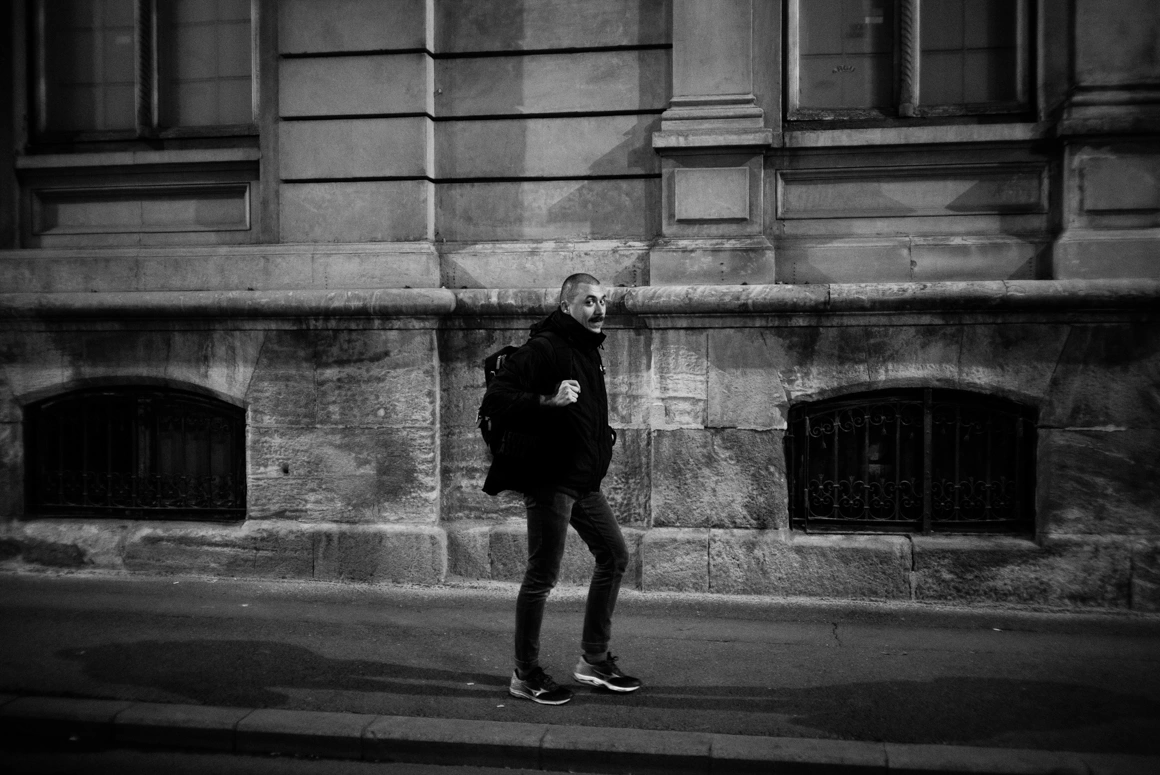 It took me a while to convince him to let me ask him some questions about his photography and I didn’t expect at all that our outing would take place on the same streets that he walks on almost every single night. We met in front of Odeon Theater and starting walking up on Victoriei, then took a left on Dacia until we got to Romana; next, we walked down on Magheru and end up in Victoriei again, just outside Novotel. All this time, we kept talking and I was stalling, waiting for him to raise his camera. I realized he wasn’t going to do this, while I was standing next to him, because that would have made him feel like too much of a show-off, so we sat down and talked in Cișmigiu Park.