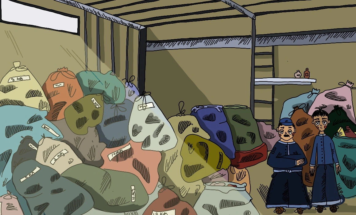 In a hall about the size of a cinema, with a narrow aisle in the middle, the only source of light is the door through which sack after sack of clothes enter. You see them wherever your eyes fall—thousands of bags piled up on shelves taller than a person. We're in a second-hand clothing warehouse on the outskirts of Bucharest, which imports wholesale textiles and sells them to neighborhood stores. The minimum quantity you can buy here is a 25-kilogram sack of clothes. About the size of a giant wardrobe.