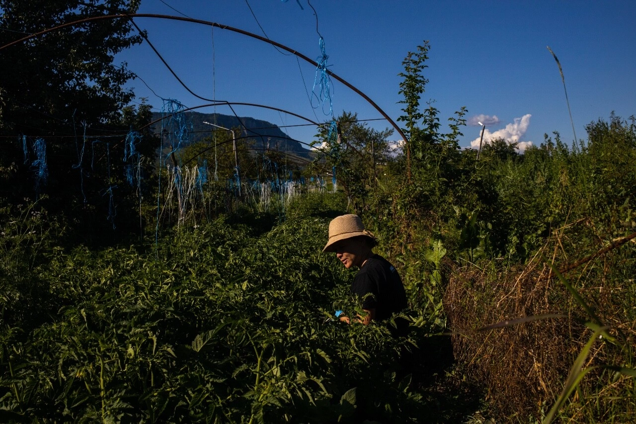 The sky is orange at sunset and we’re heading toward the home of Damia, the newest Children of the Sun community member. She lives here with her partner, Marius Căpîlna (Sică), and Amza, their one-year-old son. We walk through a pine forest, where you can sometimes come across wild boars, and Damia touches a juniper, which she tells me is used for making gin. That’s one of the many things she’s learned out here, along with recipes for syrups, jams, plum brandy, floral water, or sundried tomatoes. Sică stops to saw off some hazelnut branches, which he uses as poles to prop up the tomato and bean vines. He enjoys digging, planting, building, “anything that helps other people come here and meditate,” says the 23-year-old with a boyish air, and a perpetual smile on his face. “Living out here is fulfilling, if you see these things as a step in your evolution, ‘cause it ain’t easy.” In the winter snow needs to be shovelled off the houses and greenhouses, the firewood needs chopping and the fire needs building. During the other seasons, there’s farmwork to be done, sometimes for as long as twelve hours a day.