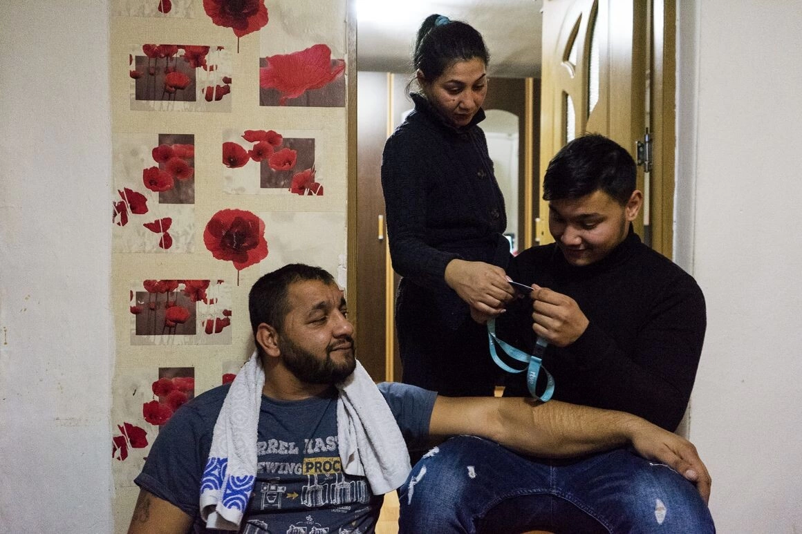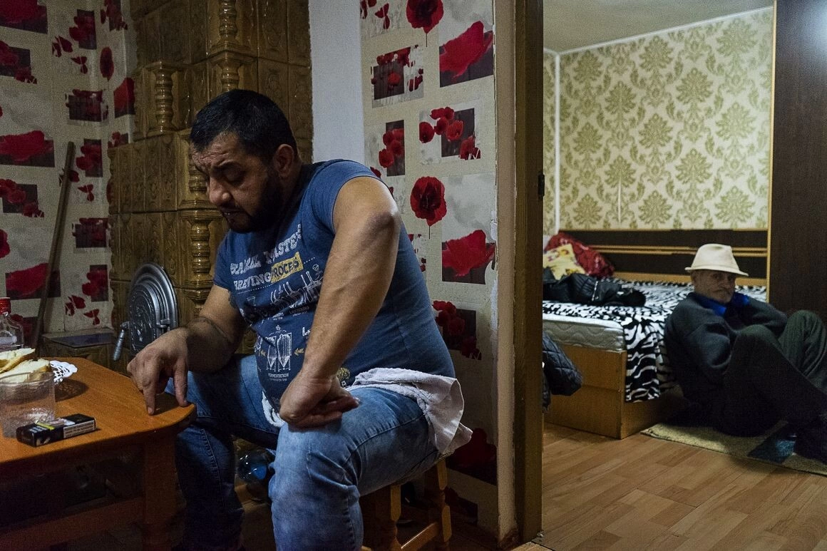 At home, in the Radu of Afumați neighborhood of Ploiești, Digudai sits on a carpet, next to a closed heating stove. He takes a long drag from a cigarette and a swig of vodka from the bottle. He’s a little upset—some family problems. “Play that song again, my queen,” Digudai tells his daughter, referring to some Brazilian funk, then a children’s song with Snow Queen, both his favorites. After the girl goes to the computer and pushes play, he holds her in his arms and kisses her cheeks.